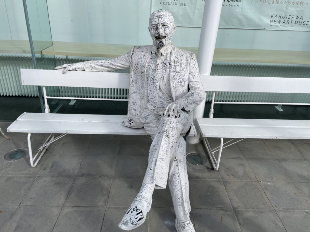 ミュージアムの前には落書きとアートの狭間のような銅像がベンチに座っていた。