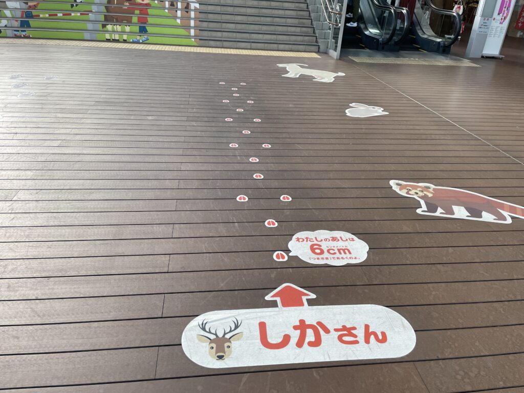 階段には、子どもが楽しめるように動物の足跡のプリントが貼ってある。
